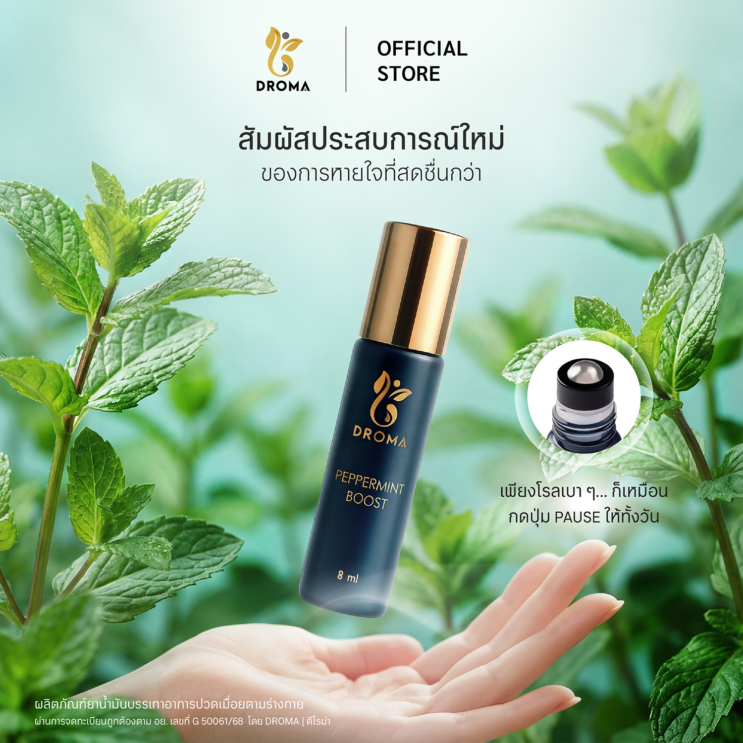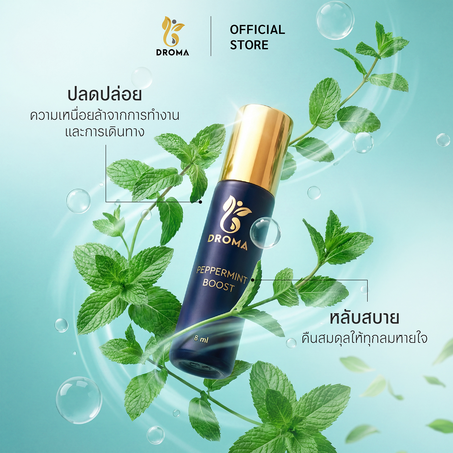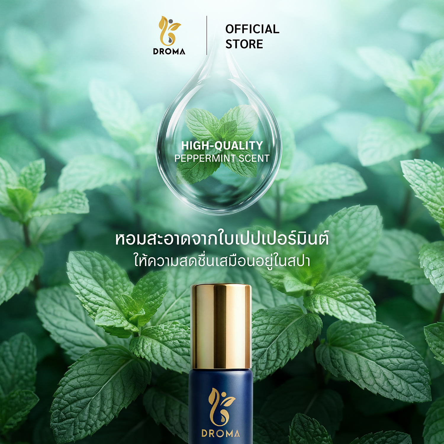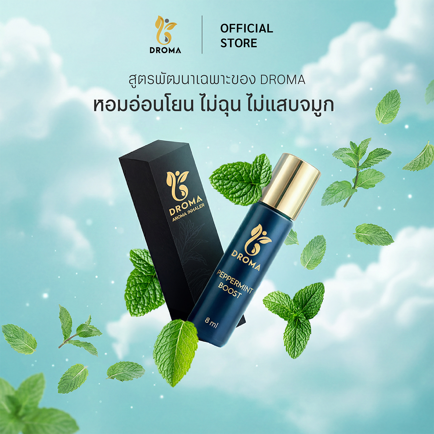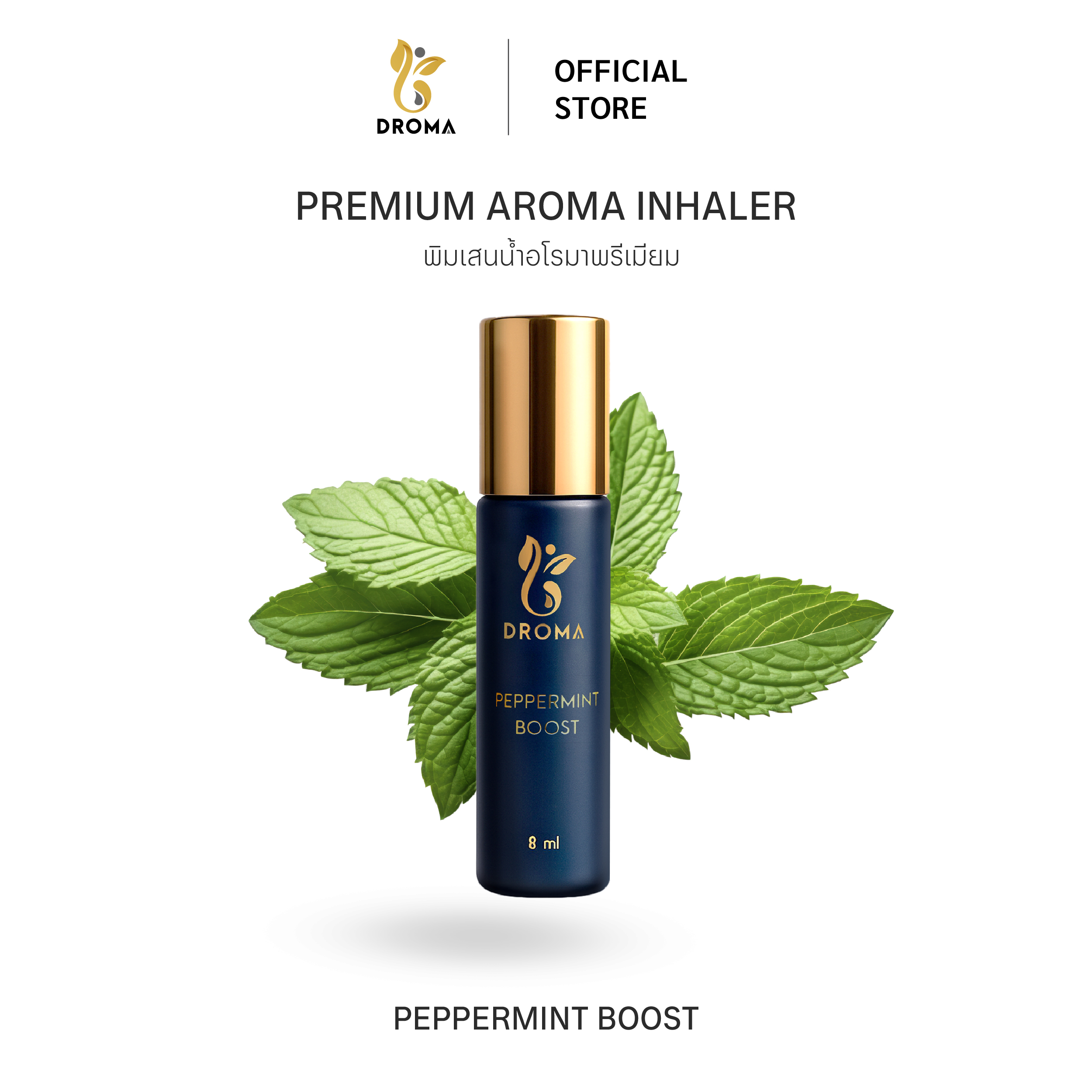 DROMA Premium Aroma Inhaler คืออโรม่าแบบโรลออนขนาด 8 มิลลิลิตร ดีไซน์หรูหราด้วยขวดแก้วเคลือบสีน้ำเงินกรม ฝาทอง สกรีนโลโก้ทอง