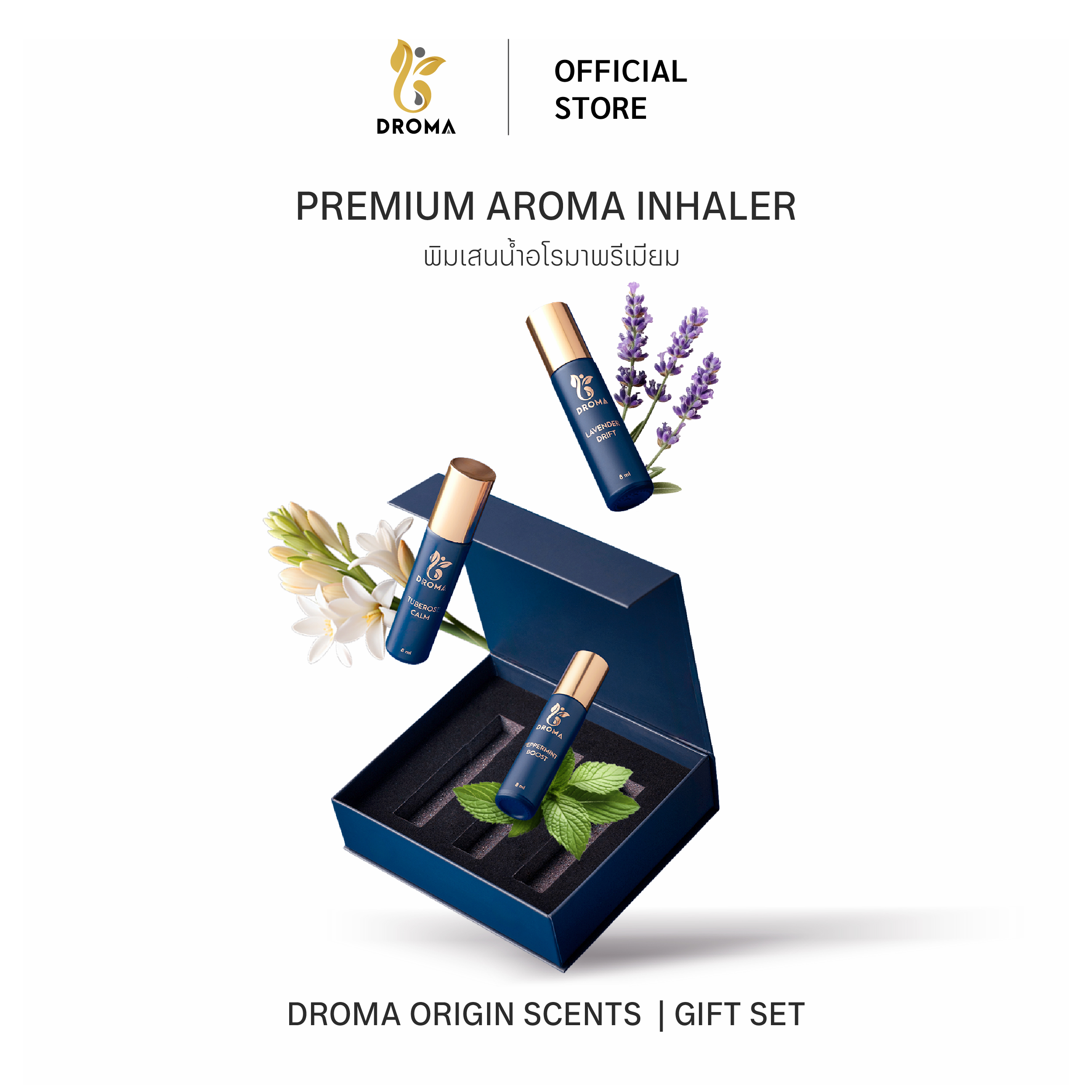 DROMA Premium Aroma Inhaler คืออโรม่าแบบโรลออนขนาด 8 มิลลิลิตร ดีไซน์หรูหราด้วยขวดแก้วเคลือบสีน้ำเงินกรม ฝาทอง สกรีนโลโก้ทอง